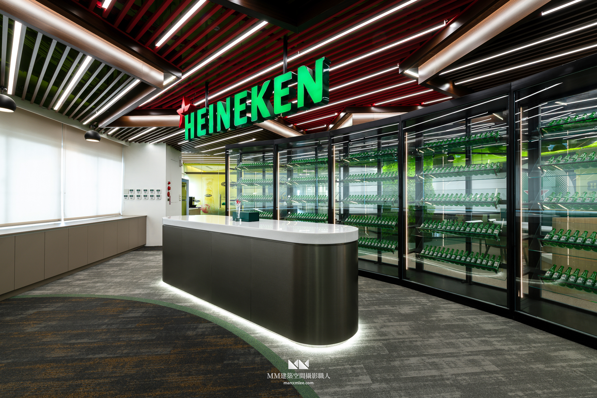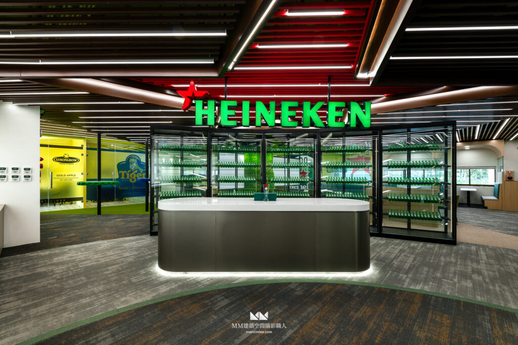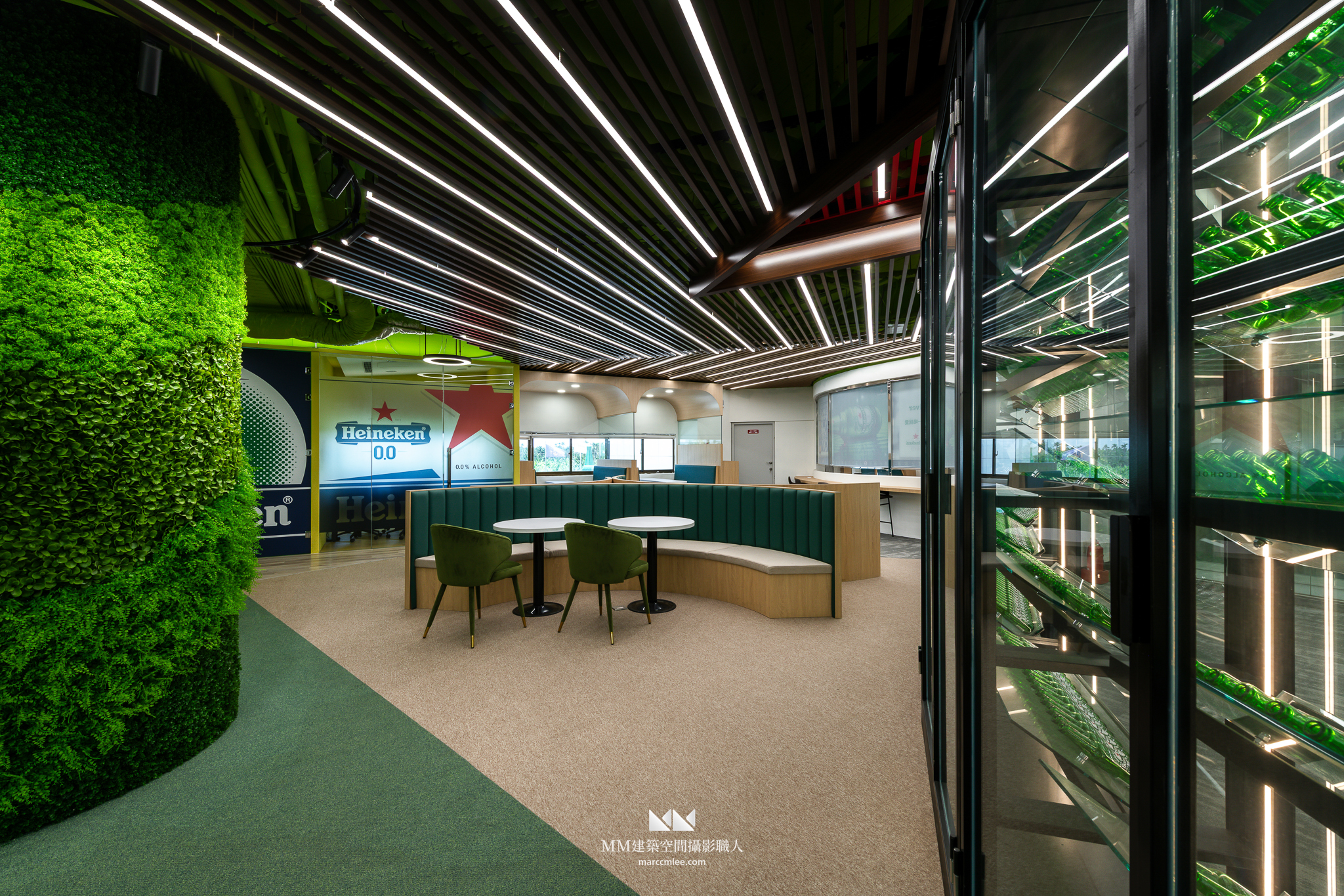 在此基礎上,設計以海尼根品牌四大核心價值「明亮、年輕、溫暖、好客」為出發點,透過「Togetherness 共聚」的設計概念,將品牌經典元素如星星、瓶架與釀酒槽,轉譯為燈光設計、訂製家具與天花造型,打造具有高度識別性的辦公空間。