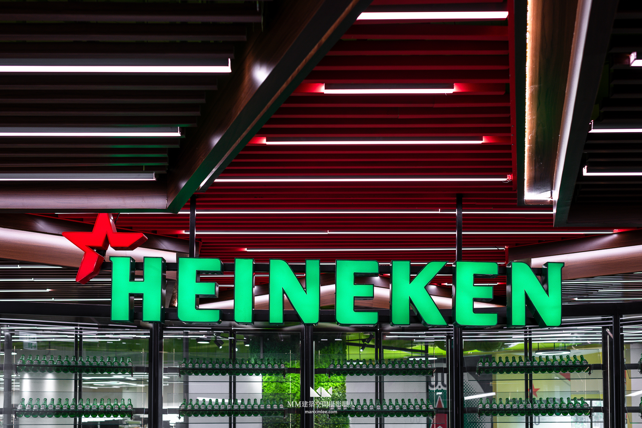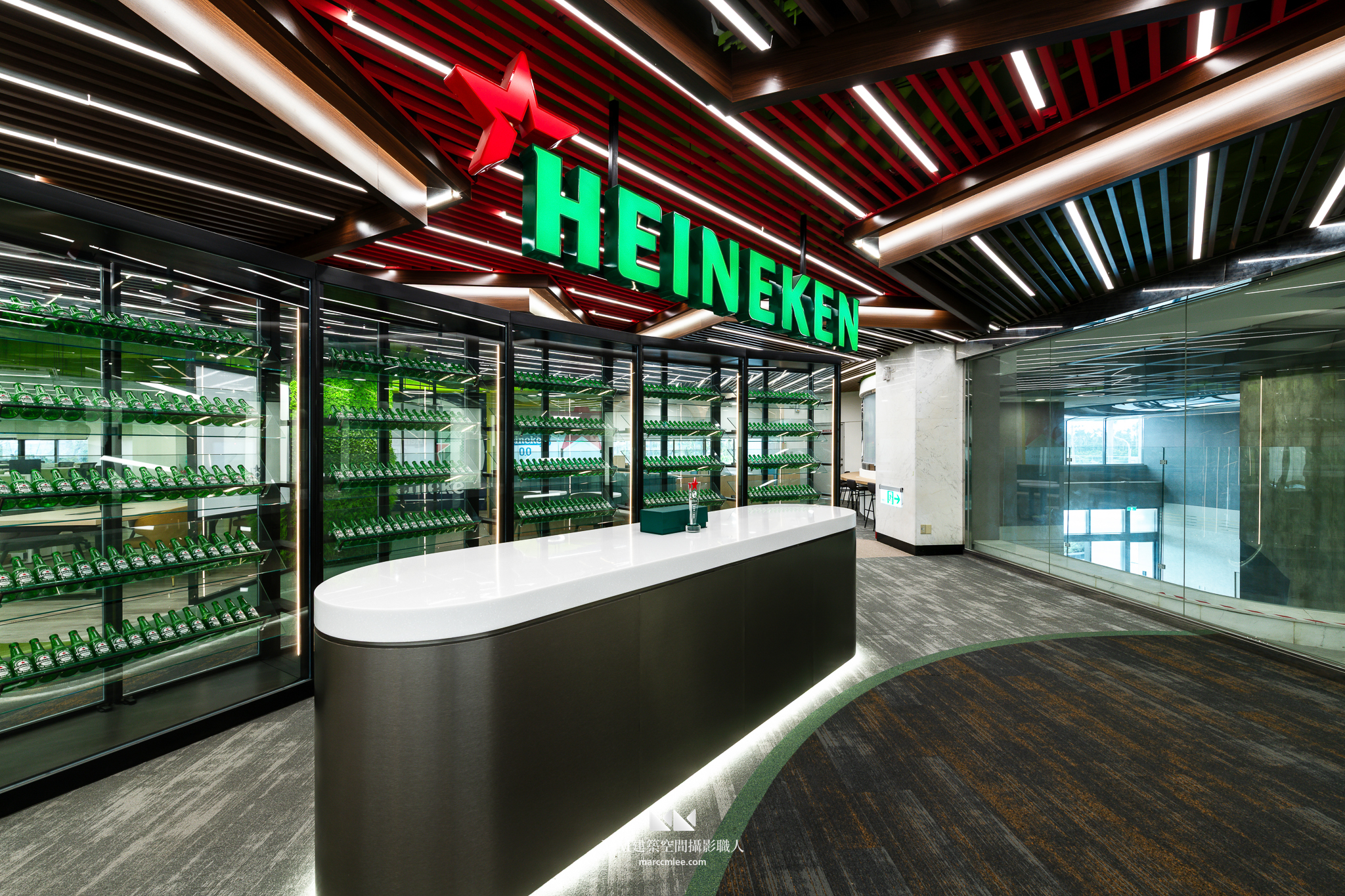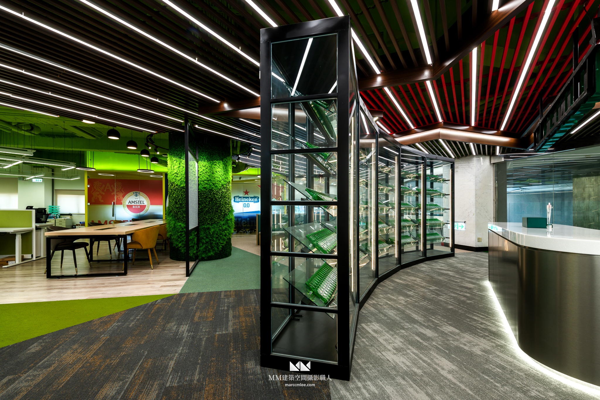 在此基礎上,設計以海尼根品牌四大核心價值「明亮、年輕、溫暖、好客」為出發點,透過「Togetherness 共聚」的設計概念,將品牌經典元素如星星、瓶架與釀酒槽,轉譯為燈光設計、訂製家具與天花造型,打造具有高度識別性的辦公空間。