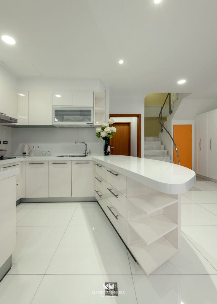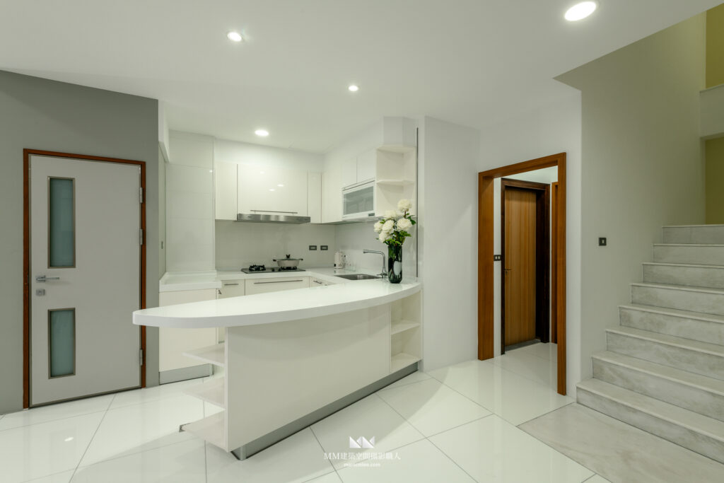 在四樓規劃上,空間被清楚分為前後兩區。首先,前側公共區域採用開放式設計,以白色為主調,搭配隱藏式收納,放大整體視覺尺度。接著,弧形中島自然串聯餐廳與廚房,不僅界定空間,也成為畫面的視覺焦點。相較之下,後側客房則保留原有櫥櫃與壁龕,經過整理後,讓舊有元素成為空間特色。