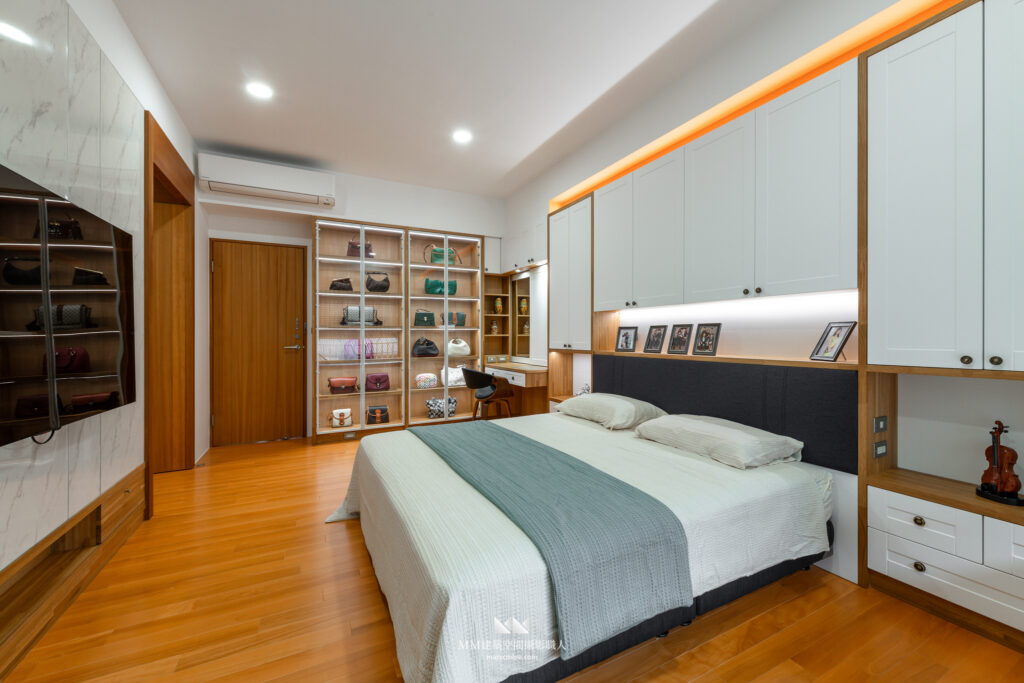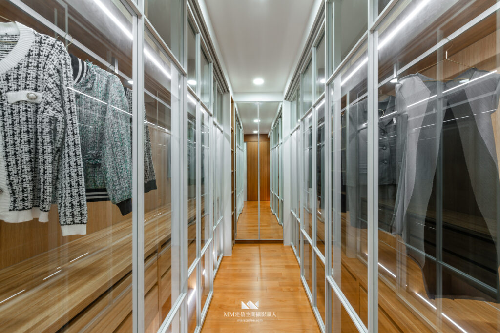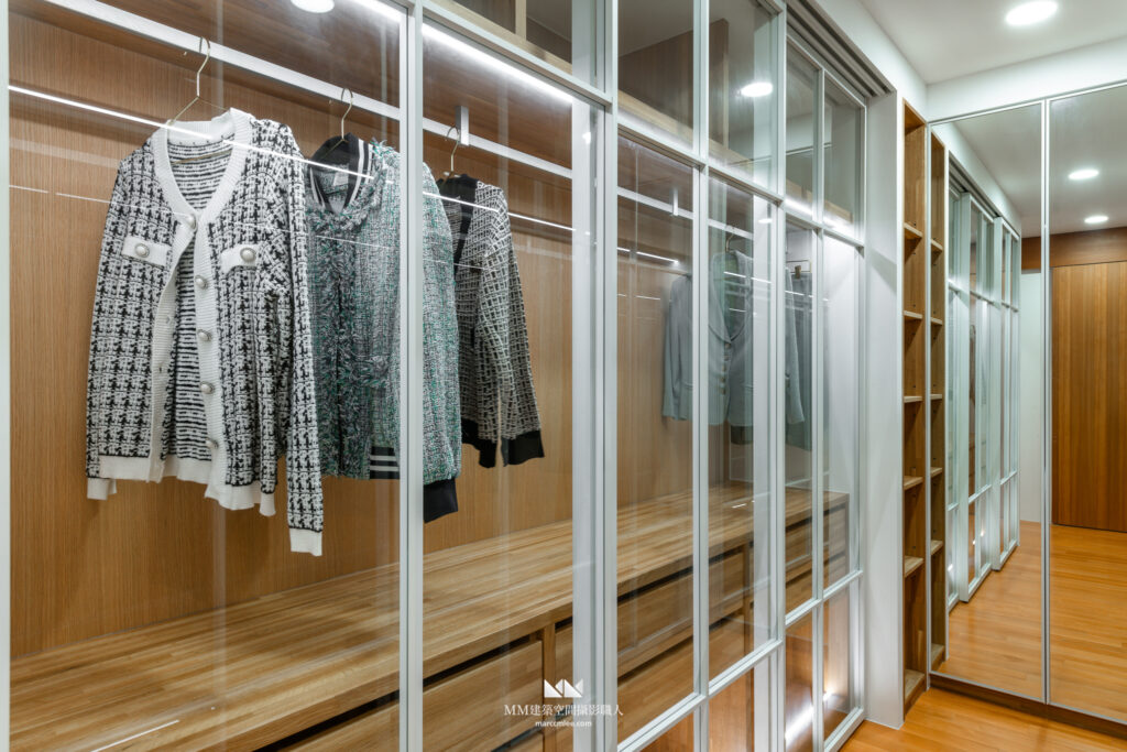 五樓則拆除多餘隔間,使洗滌與收納機能更加順暢。同時,主臥採用玻璃滑門設計,兼顧實用性與通透感,讓空間在使用上更為彈性。